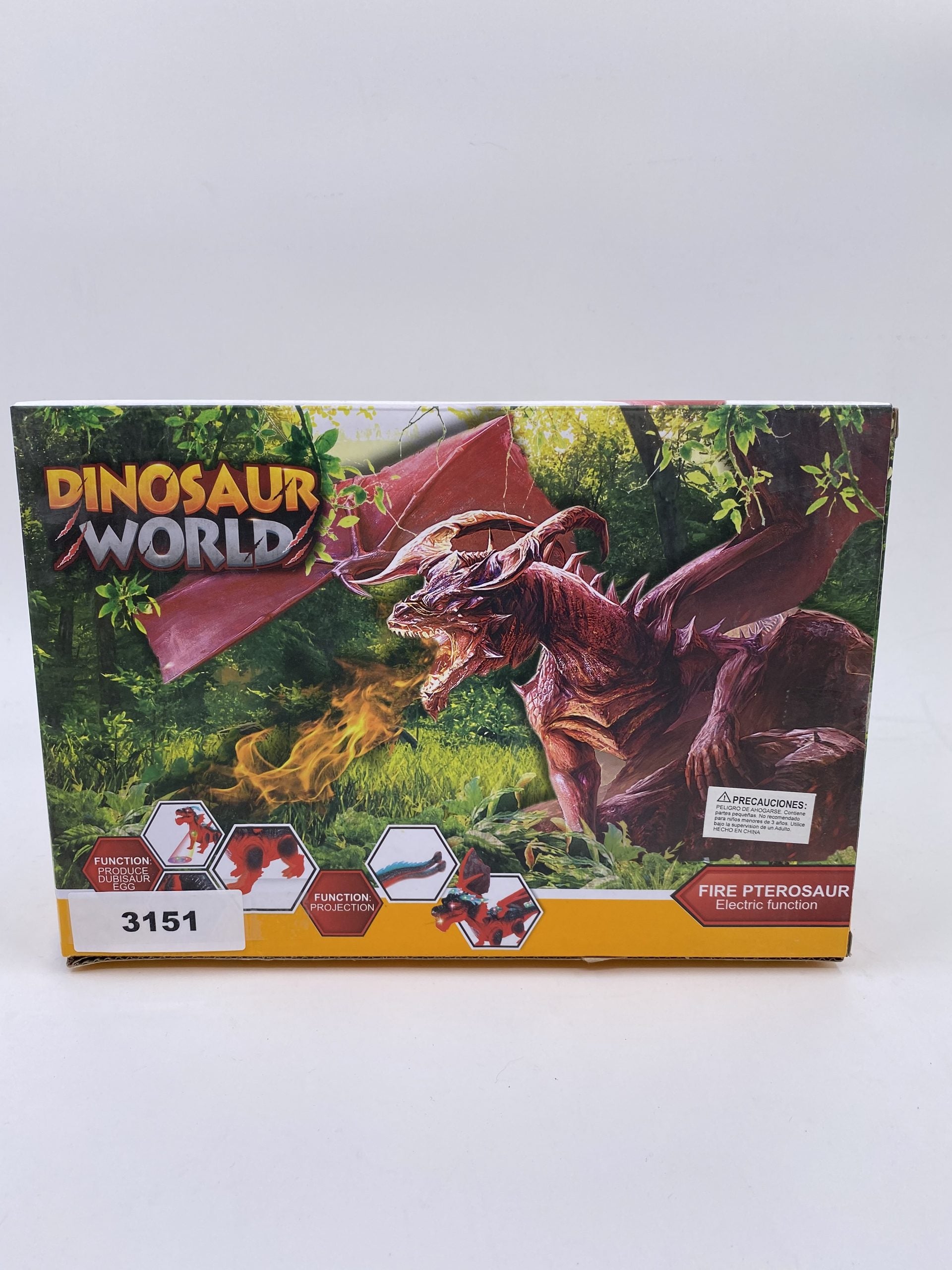Dinosaurio de color rojo que incluye luz de colores y moviemiento en las patas y alas de dinosaurio. Muy divertido para jugar con el por su luces coloridas y moviemientos.