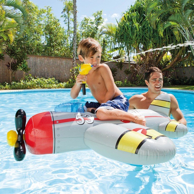 Divertido Montable Inflable en forma de Avión para niño, ideal para uso en alberca. Tiene un diseño colorido , además incluye una pistola de agua integrada en el montable y una agarradera. Cuenta con parche de reparación en caso de pinchadura.