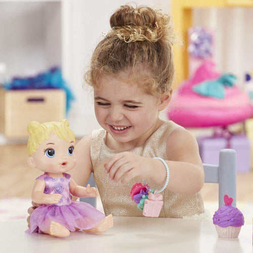 Baby Alive Bebé Fiesta de Regalos; es hora de una fiesta, Baby Alive viene con todo lo que los niños necesitan para pretender planear y organizar una celebración para su muñeca. Está vestida con un lindo vestido de fiesta morado.