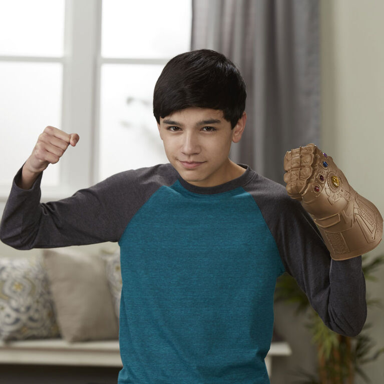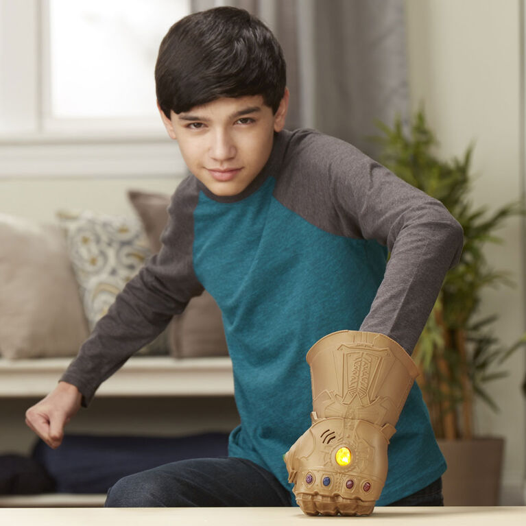 Los chicos pueden imaginar que controlan el poder de las Gemas del Infinito para dominar la galaxia con el Guantelete electrónico Infinity Gauntlet, ¡el cual cuenta con luces y sonidos! ¡Presiona el botón central para hacerlo brillar y activar efectos de sonido! El Guantelete electrónico Infinity Gauntlet está inspirado en la película Avengers: Guerra del Infinito y sirve para casi todos los tamaños de manos.